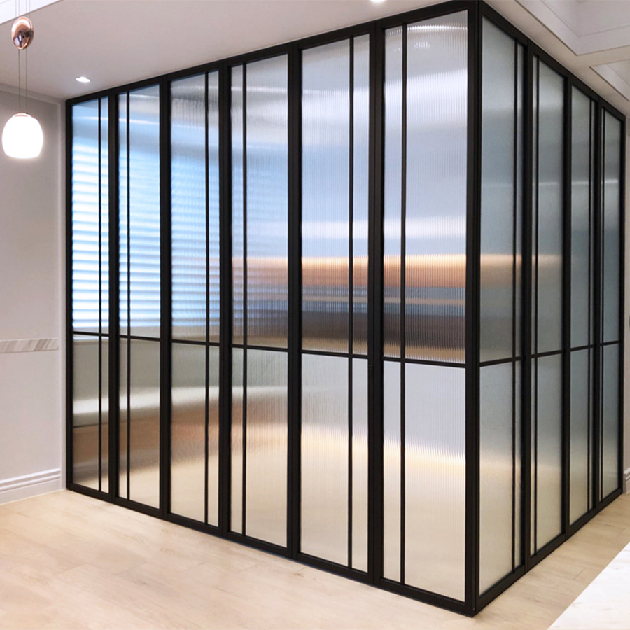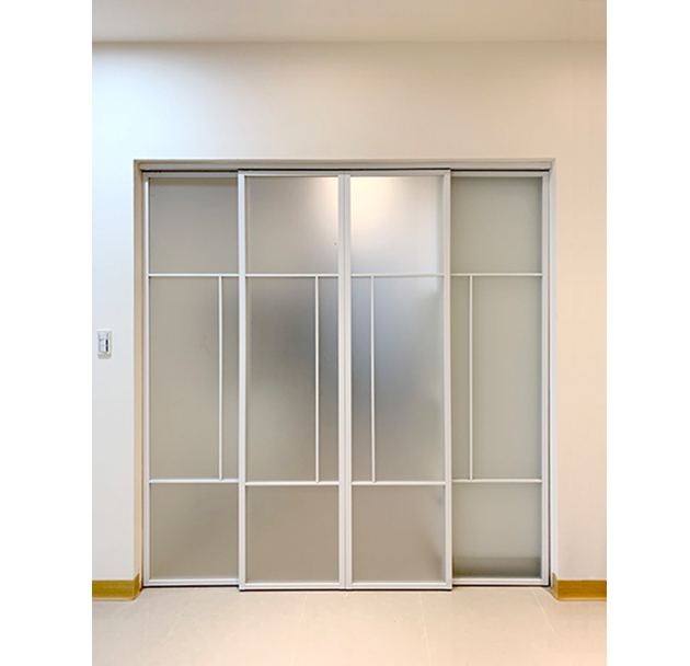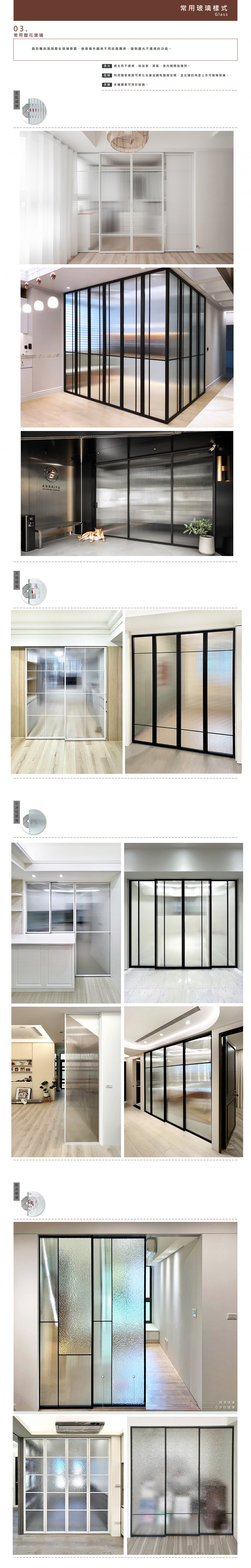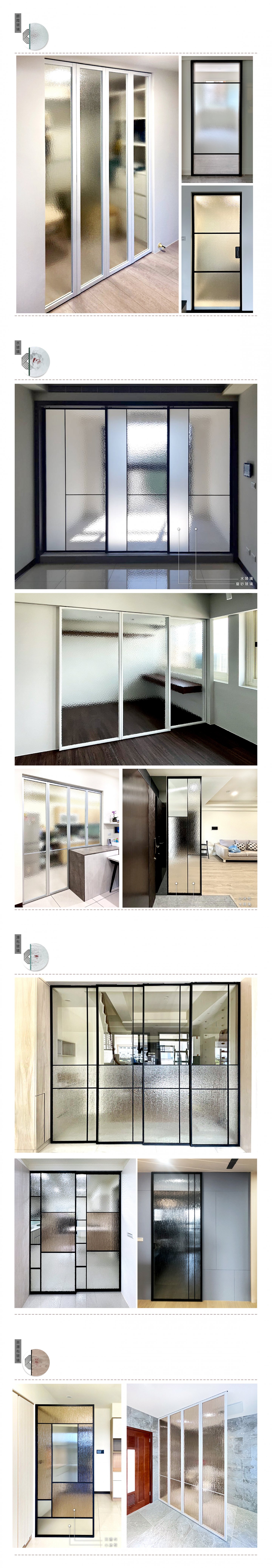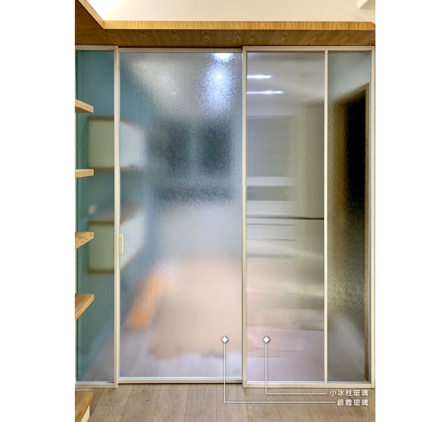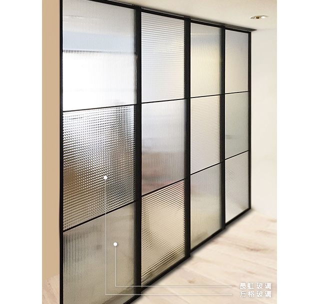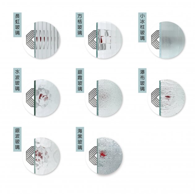 圓形雕刻滾筒壓在玻璃表面,使玻璃外觀有不同紋路圖案,達到透光不透視的功能。 透光而不透視,如浴室、屏風、室內隔間皆適用。 利用圖案表面可柔化光線並調和整個空間,且合適的角度上亦可阻隔視線。 多種圖案可用於裝飾。